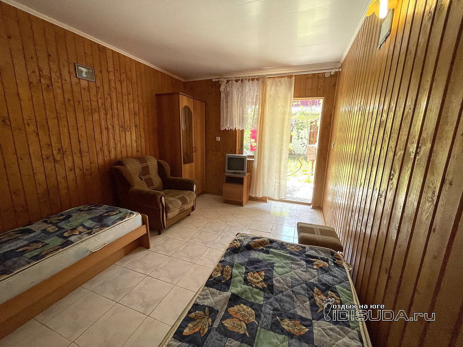 В каждом номере - две / три / раздельные 1-но спальные или 2-х спальные кровати, прикроватные тумбочки, большой 2-х створчатый шкаф с зеркалом во весь рост, телевизор, кондиционер или вентилятор, стулья, плотные шторы. Есть возможность размещения в 5-ти номерах детей на доп.месте - раскладное удобное кресло-кровать. Санузел - на этаже, имеется выход на озелененную виноградной лозой террасу или балкон с лавочками для отдыха.