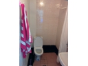 Старый ржавый душ находится над унитазом, в полу сливная дырка.